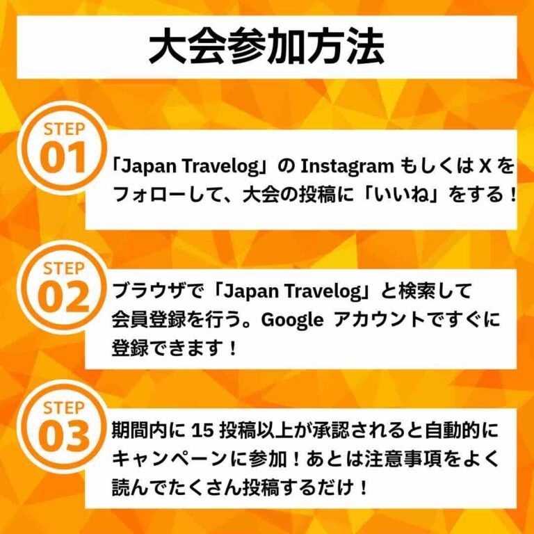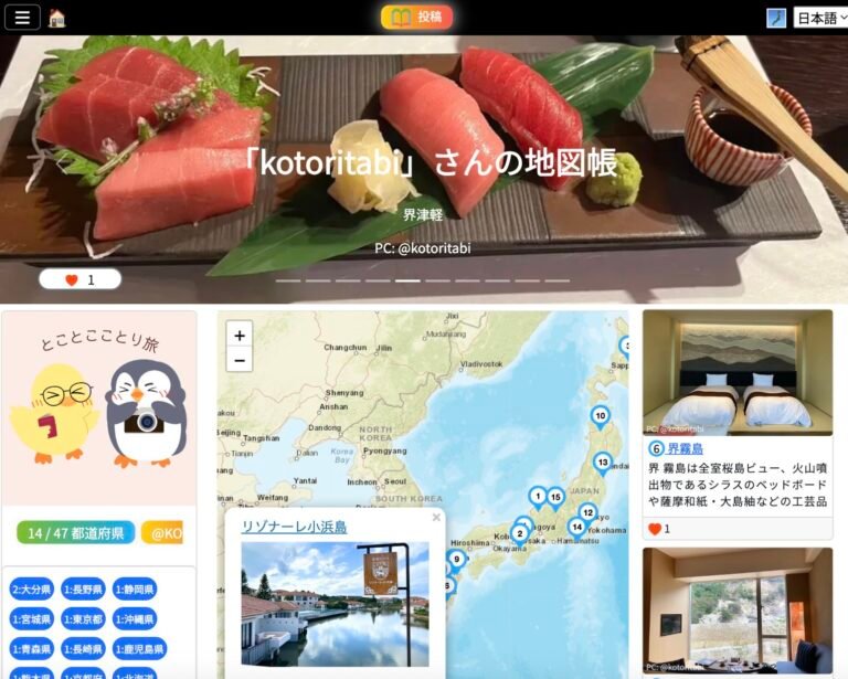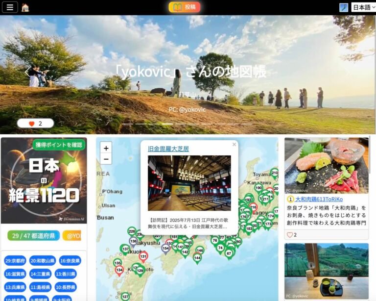 Japan Travelog 推しスポット投稿チャレンジ 推しスポットを投稿して、世界に広めよう! Japan Travelog とは 「Japan Travelog」は誰でも簡単にユニークな旅行記を作成できるSNSです。投稿は6つのカテゴリ(観光、体験、飲食、宿泊、買物、交通)に分かれており、地元の美味しい飲食店から旅先の絶景宿、秘境駅、神社仏閣など、訪れた場所を写真と文章とともに残すことができます。ぜひ、あなたの思い出をコレクションしていきましょう。投稿は自動で5か国語に翻訳されるため、使用言語を問わず楽しむことができます。 「推しスポット投稿チャレンジ」の参加方法はこちら 既存ユーザーの投稿例 観光 体験 飲食 宿泊 買物 交通 推しスポット投稿チャレンジ 開催期間 投稿期間: 2026 年 2 月 1 日 〜 2026 年 4 月 30 日 集計期間: 2026 年 5 月 1 日 〜 2026 年 6 月中旬 結果発表: 2026 年 6 月 中旬 〜 下旬 予定 チャンレンジ参加方法 必須条件① 「Japan Travelog」をGoogleで検索してユーザー登録②「Japan Travelog」上で投稿 & 15投稿以上が承認される任意条件こちらの Insta / X での紹介希望フォーム に下記情報を提出Japan TravelogのユーザーネームInstagram もしくは X のユーザーネーム (両方可)参加資格を満たし、かつ、上記をご提出いただくことで、あなたのJapan Travelog へのご投稿を、弊社Instagram 、もしくは、Xにて紹介させていただきます。 Amazonギフトカード2,000円分進呈 (先着達成者50名) 先着者決定用総ポイントを2,000ポイント獲得した方から順に、BINGO自己申告形式のように、応募フォームをご提出いただき、承認されれば、2,000円分のAmazon eギフトカードが贈呈されます(先着50名様限定)。先着者決定用総ポイントの計算方法はこちら 先着50名様は、応募フォームの提出順となっておりますが、先着者決定用総ポイントを2,000ポイント獲得していないにも関わらず、応募フォームを提出された場合は、参加資格が無効になりますので、ご注意ください。 投稿ルール 投稿が承認される条件として、1投稿につき、写真は3枚以上、文章は3行以上(目安100文字以上)となっています。悪質な改行や同じ文字の羅列、不適切な内容が見受けられた場合は、承認されない旨、ご了承ください。(参考: この2文で102文字) ポイントのルール詳細 ①カテゴリポイント 投稿は6カテゴリ(宿泊、飲食、買物、体験、交通、観光)に分かれており、獲得できるポイント数が異なります。 ②都道府県ポイント カテゴリポイントに加え、投稿場所の都道府県に応じて、ポイントが加算されます。 ③宿泊予約ポイント マイページよりホテルを予約&宿泊したことが運営側で確認でき次第、宿泊料金に応じてポイントが加算されます(事前決済のみ)。※宿泊実績の確認が完了するまでは暫定的にポイントが付与されます。投稿期間終了後、運営側で宿泊実績が確認できなかった場合は、ポイントが失効する可能性がございます。※ご自身の地図帳ページ (例) より予約いただいたユーザー名と、宿泊予約申請フォーム よりご提出いただいたユーザー名を照合して、宿泊予約確認をしているため、マイページよりご予約いただいていない場合は、加算対象外となります。予めご了承ください。 ④紹介 & ⑤被紹介ポイント 自分のプロフィール欄に記載された招待コードを使用して、紹介ポイント獲得のチャンス。ユーザー未登録者が既存ユーザーの招待コードを入力し、15投稿承認されると、紹介達成として認定され、紹介者は200ポイント、被紹介者は100ポイントを獲得することができます。 🏃♀️🏃♂️先着者決定用ポイント計算方法🏃♂️🏃♀️ 本チャレンジにおける先着者決定用総ポイントの計算方法は、「①~⑤の合計ポイント」となります。各ポイント数および合計ポイントは、Japan Travelog 上のご自身のマイページにて、「獲得ポイントを確認」ボタンを押して確認可能です。 ①カテゴリポイントと②都道府県ポイントは、ご自身の投稿が Japan Travelog 事務局によって承認(いいね)されたタイミングで自動付与されます(早ければ当日中、遅くとも投稿から1週間以内)。投稿ルールの基準を満たしていない場合は、承認をできかねる旨、ご了承ください。 ③宿泊予約ポイントは、宿泊実績の確認が完了するまでは暫定的にポイントが付与されます。投稿期間終了後、運営側で宿泊実績が確認できなかった場合は、ポイントが失効する可能性がございます。 ④紹介ポイントは、被紹介者があなたの招待コードを利用して登録し、被紹介者の15投稿が承認されたタイミングで自動付与されます。 ⑤被紹介ポイントは、他の紹介者の招待コードを利用して登録し、ご自身の15投稿が承認されたタイミングで自動付与されます。 個人・商用利用、両方OK! 観光・体験・飲食・宿泊・買物・交通の6大カテゴリーの中から最適なものを選んで記事をご投稿いただけます。旅行記の共有に利用するも良し、おすすめの場所を紹介するも良し、ご自身のお店を紹介するも良し、様々な用途にご利用いただいています。